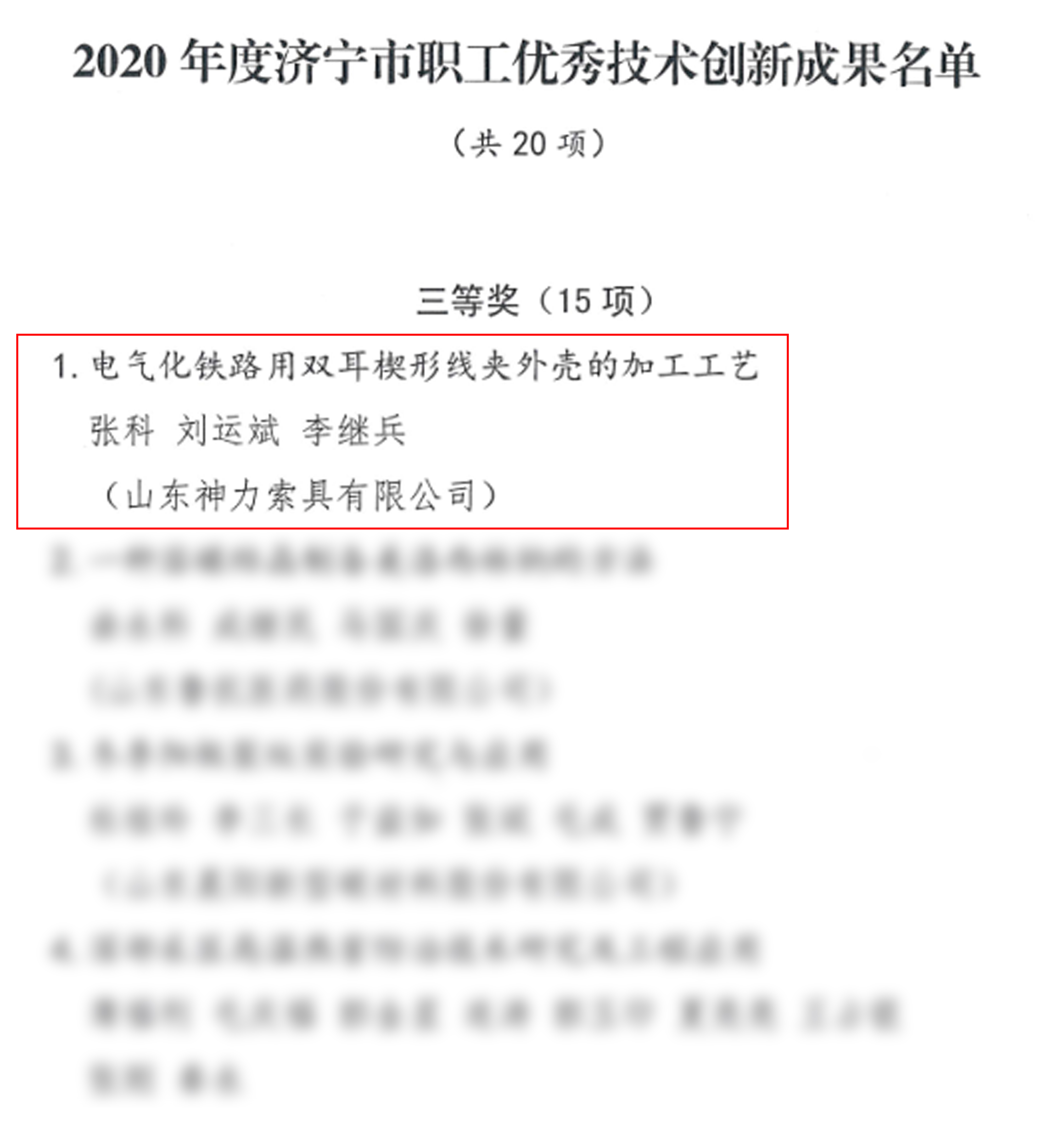 在濟(jì)寧市職工優(yōu)秀技術(shù)創(chuàng)新成果名單中,我公司創(chuàng)新成果“電氣化鐵路用雙耳鍥型線夾外殼的加工工藝”榮膺三等獎(jiǎng)。為積極踐行新發(fā)展理念,弘揚(yáng)勞模精神、勞動(dòng)精神、工匠精神,市總工會(huì)對(duì)創(chuàng)新小組主要成員張科、劉云斌、李繼兵各獎(jiǎng)勵(lì)1000元。