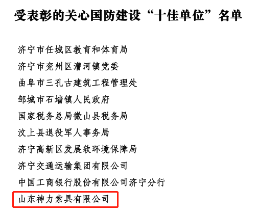 會(huì)議中,山東神力索具有限公司被授予“關(guān)心國防建設(shè)十佳單位”榮譽(yù)稱號(hào),公司總經(jīng)理杜大平作為代表上臺(tái)領(lǐng)獎(jiǎng),充分體現(xiàn)了上級(jí)領(lǐng)導(dǎo)對(duì)我公司國防建設(shè)工作的認(rèn)可和重視。