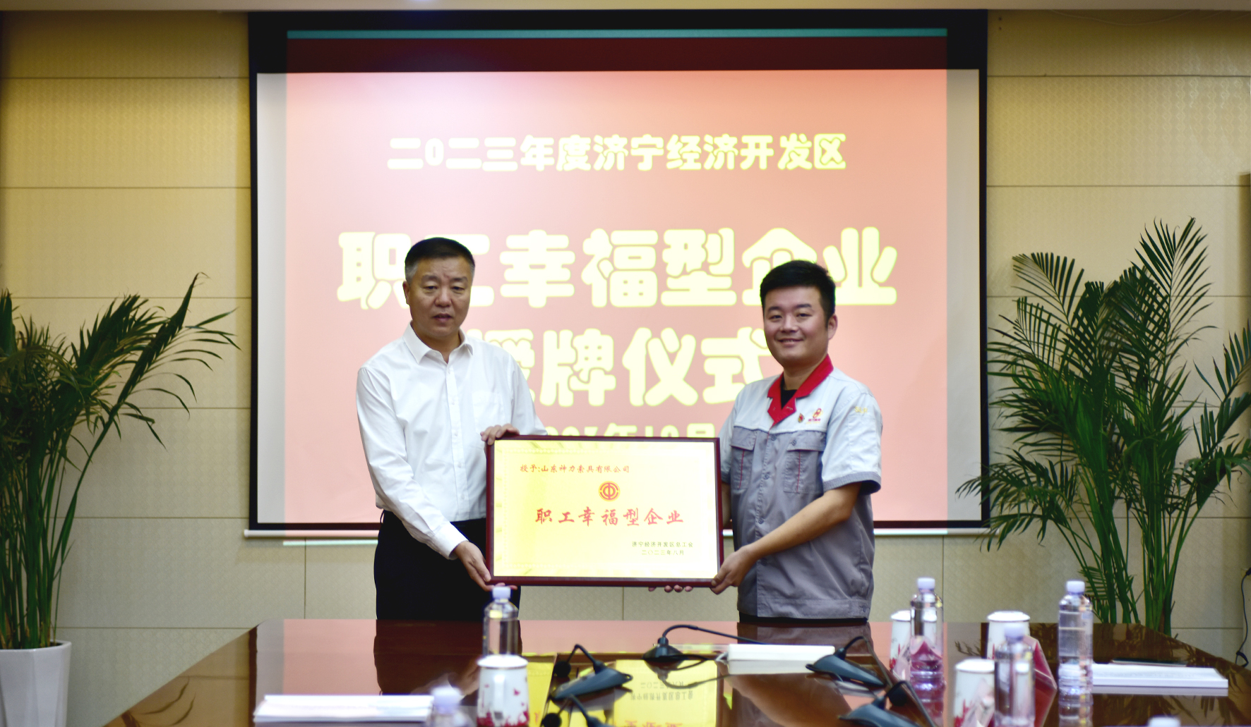 10月11日,濟寧市商貿(mào)物流園區(qū)管理服務(wù)中心副主任、區(qū)總工會主席盛春亭,區(qū)總工會常務(wù)副主席徐紅英一行來我司舉行“職工幸福型企業(yè)”授牌儀式。