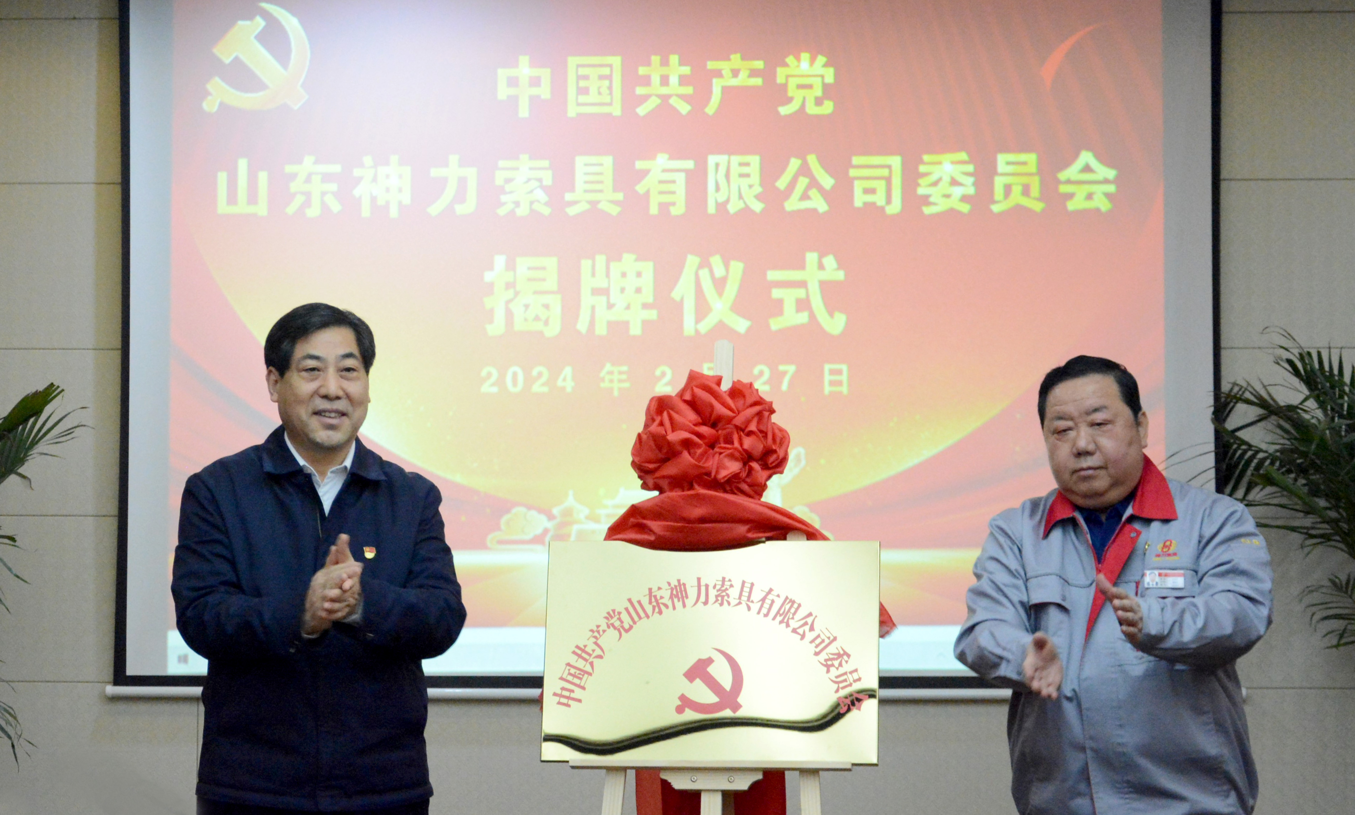 園區(qū)綜合黨委書記柳軍宣讀《關(guān)于成立山東神力索具有限公司黨委的批復(fù)》。區(qū)黨工委書記、管委會(huì)主任劉曉林與神力索具黨委書記杜亞中共同為“中國(guó)共產(chǎn)黨山東神力索具有限公司委員會(huì)”揭牌!