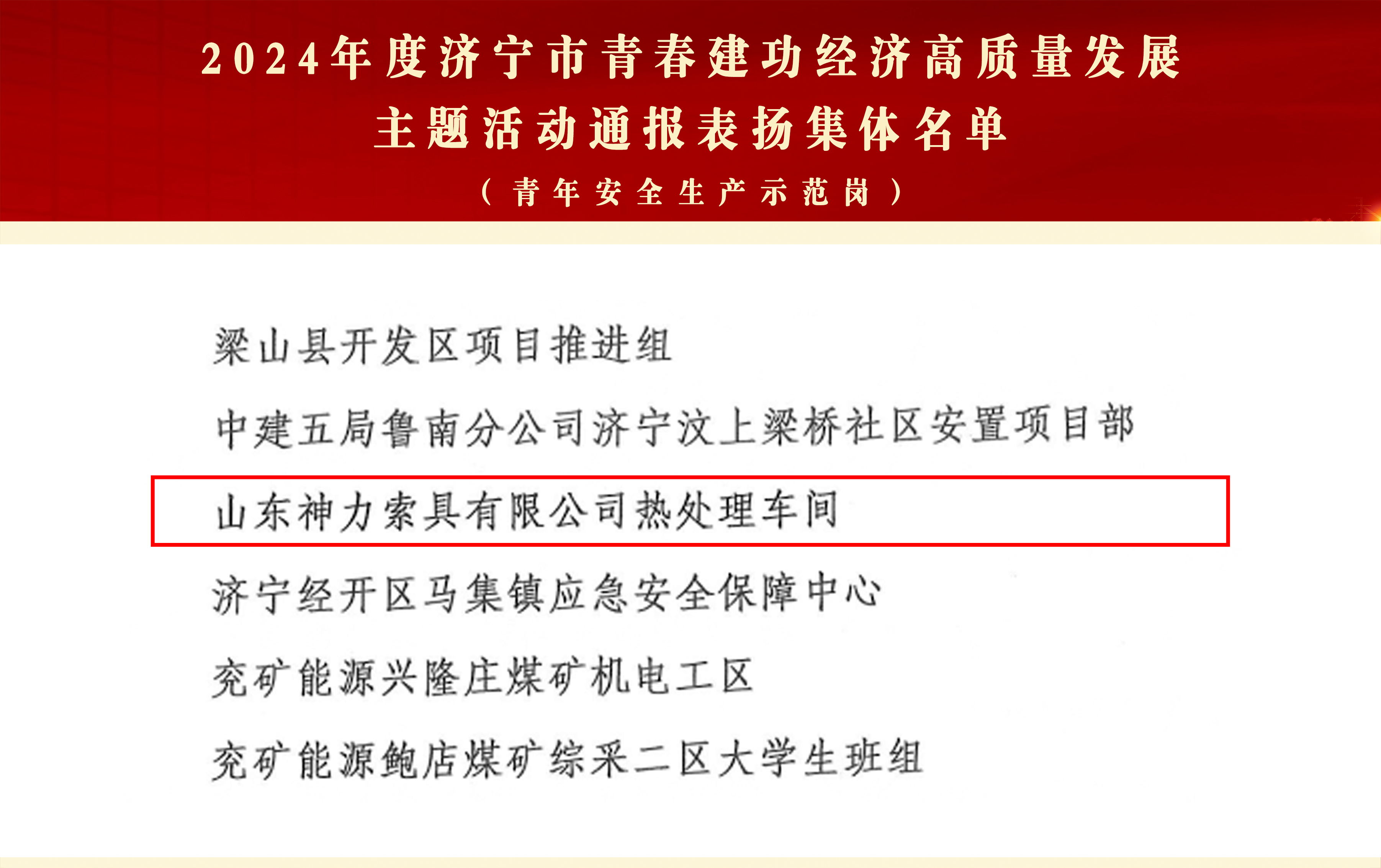 近日,共青團(tuán)濟(jì)寧市委發(fā)布《關(guān)于表揚(yáng)2024年度濟(jì)寧市青春建功經(jīng)濟(jì)高質(zhì)量發(fā)展主題活動(dòng)中表現(xiàn)突出集體的通報(bào)》。其中,山東神力索具有限公司熱處理車間的青年團(tuán)隊(duì)表現(xiàn)卓越,在安全生產(chǎn)管理方面展現(xiàn)出非凡能力,榮獲2024年度“青年安全生產(chǎn)示范崗”稱號。這一殊榮,不僅是對該分廠青年職工勇于擔(dān)當(dāng)?shù)母叨日J(rèn)可,更是企業(yè)借助青春力量推動(dòng)高質(zhì)量發(fā)展的鮮活例證。